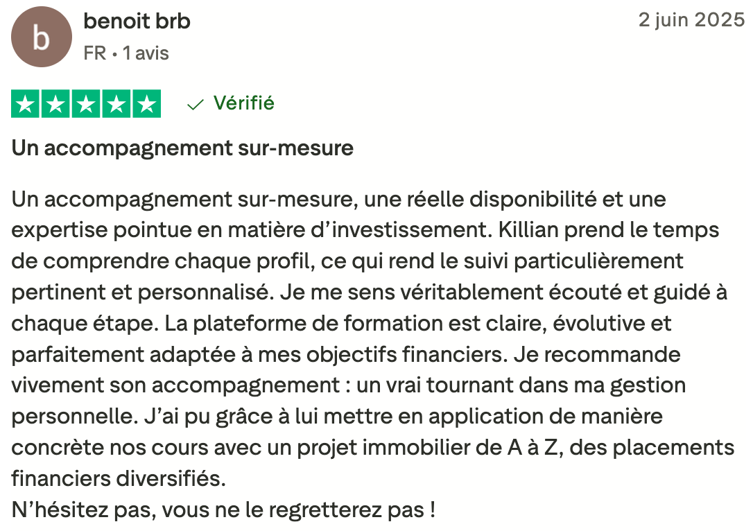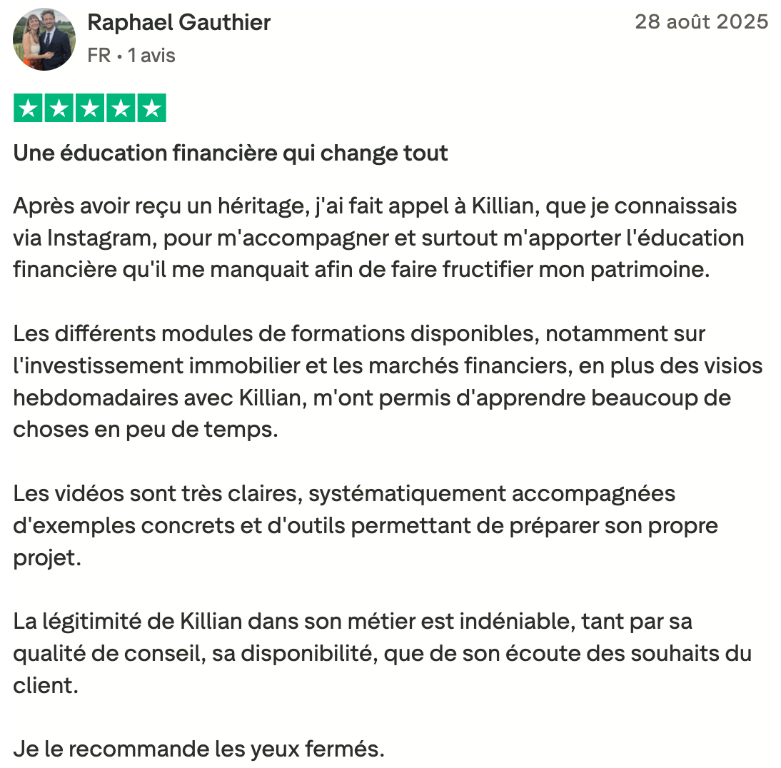 Immobilier, bourse, fiscalité : tu ne prends plus aucune décision seul. Je t'accompagne pas à pas pour t'aider à investir sereinement, éviter les erreurs et bâtir un patrimoine solide pour les 10 prochaines années.